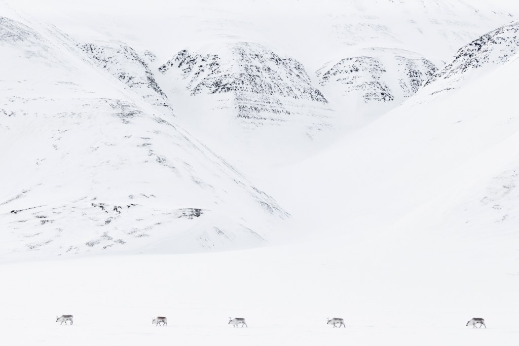 On day three of our expedition, we took a slightly slower morning start and instead had a late afternoon and evening exploration of the Templefjorden area. This proved a boon, giving us our best Reindeer experience during the trip and one of the best I have ever had. With an abundance of fresh, clean snow on the mountains and lower valley in this area and more than a dozen reindeer, the opportunities were ongoing, and we spent several hours photographing them as they curiously approached us and retreated against the mountains.