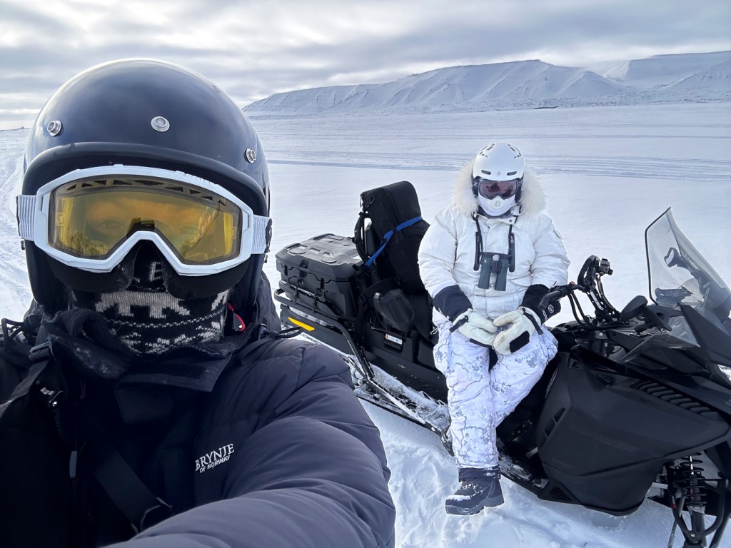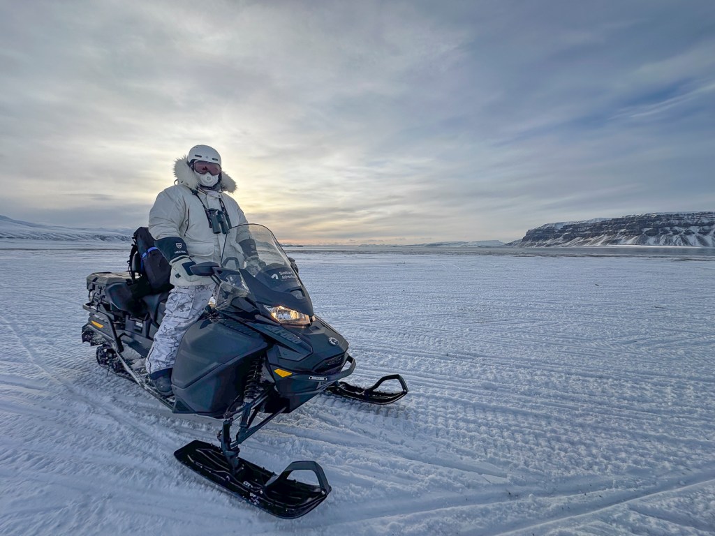 In April of 2026, I led a private 5-day winter snowmobile expedition to Svalbard for wildlife photography. The purpose of this expedition was to explore, on land, the landscape and wildlife within a day’s scooter drive of Longyearbyen. Svalbard is vast, and there is much to discover on land on a winter trip. Exploring by snowmobile on land meant we could stop wherever we wished to photograph wildlife as we found it. Using snowmobiles also means we can get much closer to wildlife than is usually possible on a ship. Staying in Longyearbyen also meant we had a warm base from which to operate, with hot showers and a choice of restaurants in the evenings.