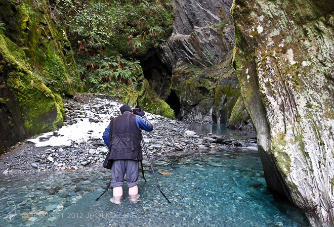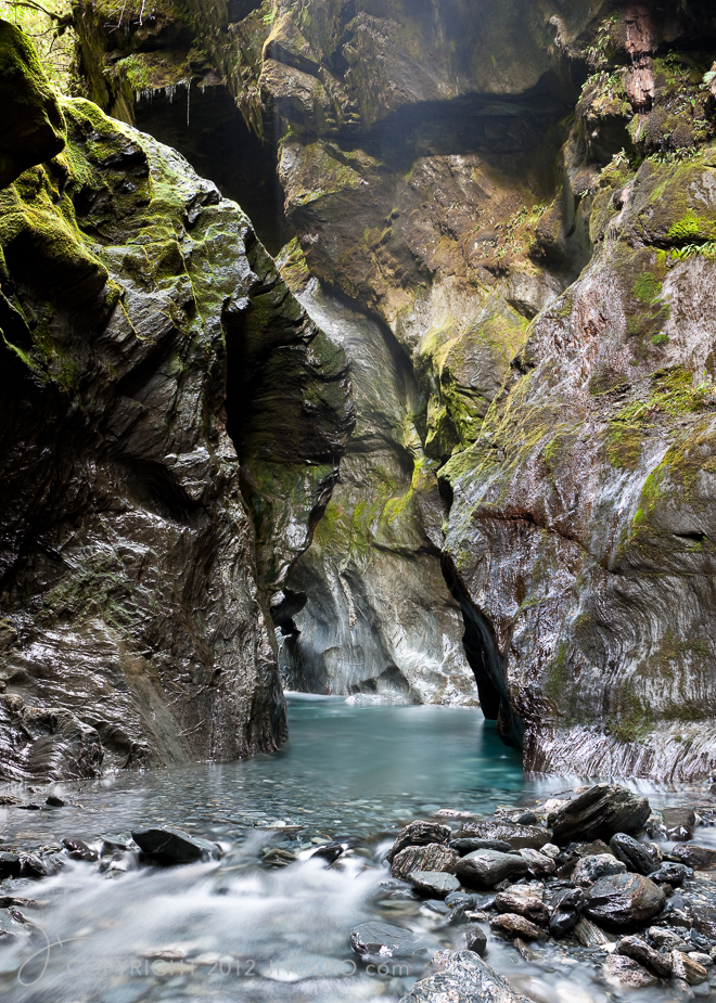 Whilst travelling in the South Island of New Zealand last July between locations we stumbled across a well hidden slot canyon just off the side of the road – A hidden gem as it were. I would wager that more than 99.9% of people driving past this location would never even know its there. There are no signs and no markers of any kind. The only clue is a bridge crossing with what looks at first blush like a cave to one side. As we crossed over the bridge I happened to be looking in the right direction, as was Phillip our guide and I just caught a glimpse of what looked like a really beautiful glacial stream feeding out of a cave. Phillip turned to look at me to see if I had spotted the location; which I had. The excitement in the air was palpable and it must have been written on my face because Phillip had that cheeky look of someone about to reveal something truly very special. As indeed he did.