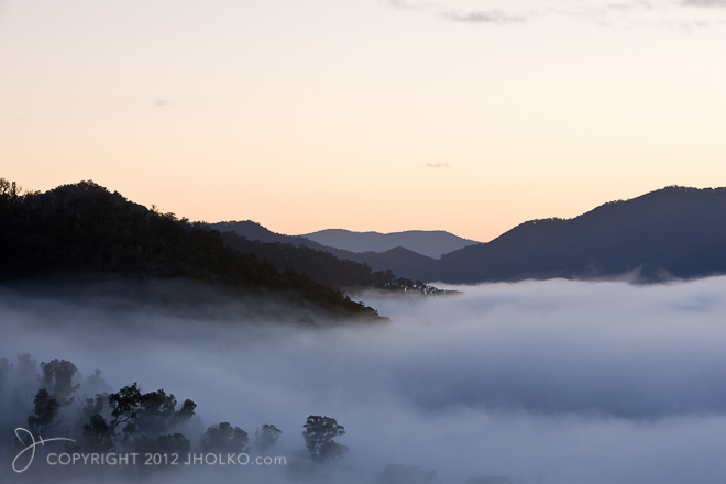 The road and drive up to Mount Buffalo in the Victorian Alps is one of my favourites in Victoria. The road snakes around the mountain and at various points provides excellent views to both the East and West for Sunrise and Sunset photography. There are lots of opportunities for landscape photography at Mount Buffalo, but some of the best in my experience are actually on the drive up the mountain. This photograph was taken just before sunrise looking into the Buckland Valley filled with fog. When I left my hotel in the pre-dawn dark and started the drive up the mountain I was unsure if there was going to be any opportunity for photography as visibility was so poor. After climbing half way up the mountain I emerged above the fog and cloud just as the sun was about to rise and was able to take this photograph literally from the side of the road. The swirling cloud and fog in the gum trees in the lower left hand corner of the frame provides the depth and dimensionality that make this photograph enjoyable for me. The orange and yellow glow of dawn adds a wonderful warmth and contrast to the cold blue of the fog. A higher resolution copy of this photograph is also in my Australian Portfolio on my website at www.jholko.com
