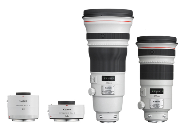 In August 2010, Canon introduces two improved supertelephotos and companion extenders (from L to R): Extender EF 2X III, Extender EF 1.4X III, EF 400mm f/2.8L IS II USM, and the EF 300mm f/2.8L IS II USM (note that extenders are not shown to scale with lenses)