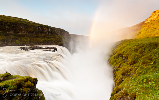 I arrived at Gullfoss shortly before sunrise and grabbed a quick power nap in the car whilst I waited for first light. Dawn bought with it cloudy overcast conditions with no sign of colour in the sky; but I took the short walk down to the falls anyway in the hope something would happen – and indeed it did.As is common in Iceland the clouds started to break up and for a period of no more than just a few minutes shortly after sunrise. The rising sun lit the waterfall and spray creating a stunningly beautiful rainbow whilst throwing gorgeous warm light across the grasses and distant hill. This is one of my favourite waterfall photographs from my time in Iceland. A higher resolution version of this photograph is on my Portfolio website  at http://www.jholko.com under Iceland. Prints are available upon request.