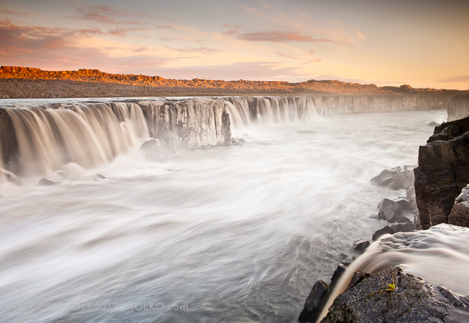 Just a short ten minute walk upstream from Europe’s largest waterfall ‘Dettifoss’ is the spectacular waterfall(s) ‘Selfoss’. Unlike the sheer might and power of Dettifoss, Selfoss consists of a large number of smaller waterfalls all cascading over a long rocky ledge on both sides of the ravine. It is as spectacular and awe inspiring as Detifoss and can be photographed from both sides of the river. This photograph was taken shortly after sunrise as the rising sun just kissed the lip of the rocky backdrop. This was probably the most challenging photograph I made in Iceland. I was standing in the middle of a huge plume of spray that had soaked both me and my camera gear. Everything, including my lens, camera and ND filter were wet. This was one of only a few frames that I managed to get where the LEE filter was not covered in water droplets. A higher resolution copy of this photograph is on my portfolio website at http://www.jholko.com in the Iceland section. Prints available on request.