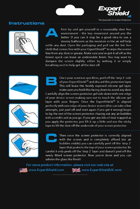 Applying the shield to your device is a straightforward three step process as documented on the back of the product: