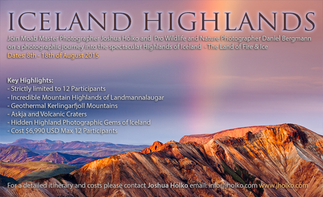 Daniel Bergmann and I are very pleased to announce a brand new workshop for Iceland next year that focuses exclusively on the interior and highland regions of this incredible country. The workshop will run from the 8th of August until the 18th of August 2015 and will take us from the capital city of Reykjavik into some of the most remote, spectacular and rarely visited highland areas of Iceland.