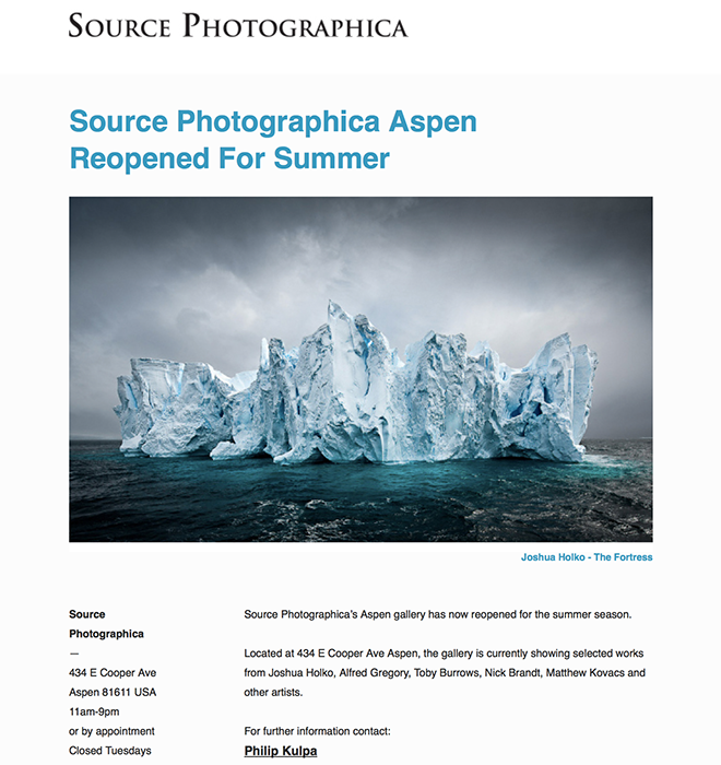 If you are fortunate to find yourself in or around Aspen in the USA over the next few weeks for the Summer season then be sure to stop into the Source Photographica gallery where I have a selection of my Iceland and Antarctica photographs on display. The gallery is open from 11am – 9pm Sunday – Monday (closed Tuesdays) and by appointment.