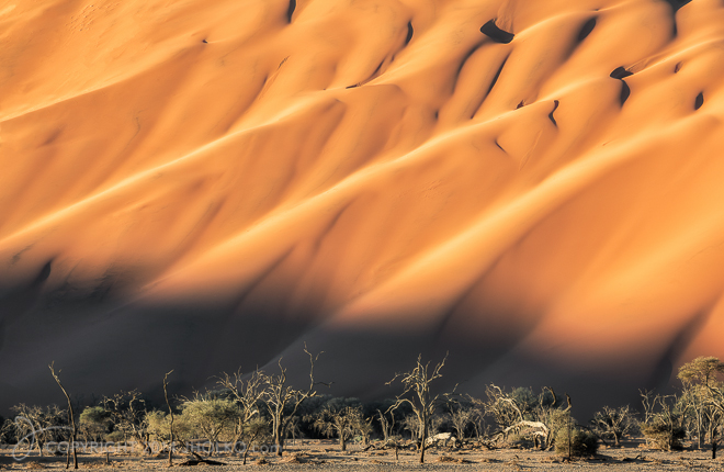 My photograph of the month for July is from the desert of Namibia in Africa. I shot this image on my recent overland Safari workshop by the roadside at Sossasvlei late in the afternoon. I recall being instantly drawn to the incredible texture and folds in the giant red sand dune juxtaposed against the fossilised dead trees. I was fortunate to also have some wonderful afternoon light and blowing sand to add atmosphere. This is one of my favourite photographs from my recent trip to Namibia. I used the Canon 200-400mm F4L IS Lens with inbuilt 1.4 Teleconverter at 1/400th of a second at ISO200 on the Canon 1DX.