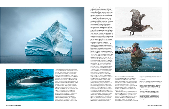 The latest March 2017 issue of Outdoor Photography magazine features a new interview and article on my passion for Polar Photography. You can download the full interview by single issue purchase or subscription.