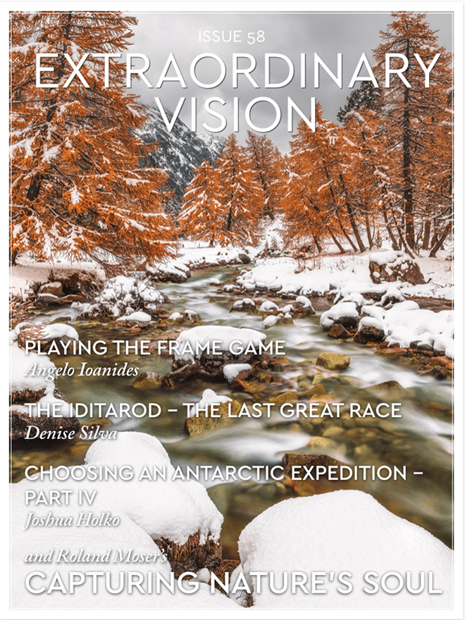 Extraordinary Vision Magazine issue #58 has just published Part Four of a recent series of Articles I penned on How to Choose an Expedition to Antarctica. Part Four is all about what equipment is going to best help you capture the majesty of Antarctica. Choosing the right expedition will make or break the photographic opportunities you will experience in Antarctica. If you are planning or considering a future photographic expedition to Antarctica I recommend you take a few moments out of your day and check it out. Part One, Two and Three were published in earlier issues and are available here on my blog and through EV magazine.