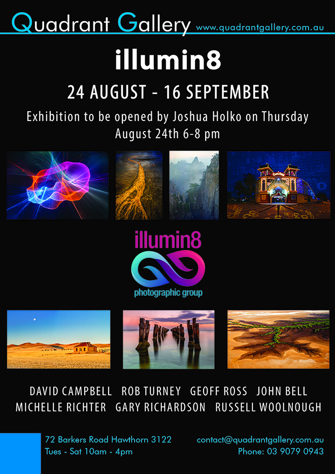 Thursday next week (August 24th) I will be opening a new exhibition titled ‘illumin8’ at the Quadrant Gallery in Barkers Road Hawthorn (Melbourne Victoria). The exhibition includes a variety of photographic works and styles from a small collection of Australian photographers. Photography from David Campbell, Rob Turney, Geoff Ross, John Bell, Michelle Richter, Gary Richardson and Russell Woolnough. The exhibition opens at 6pm. If you are in Melbourne feel free to stop past and say hello and enjoy some local photography.