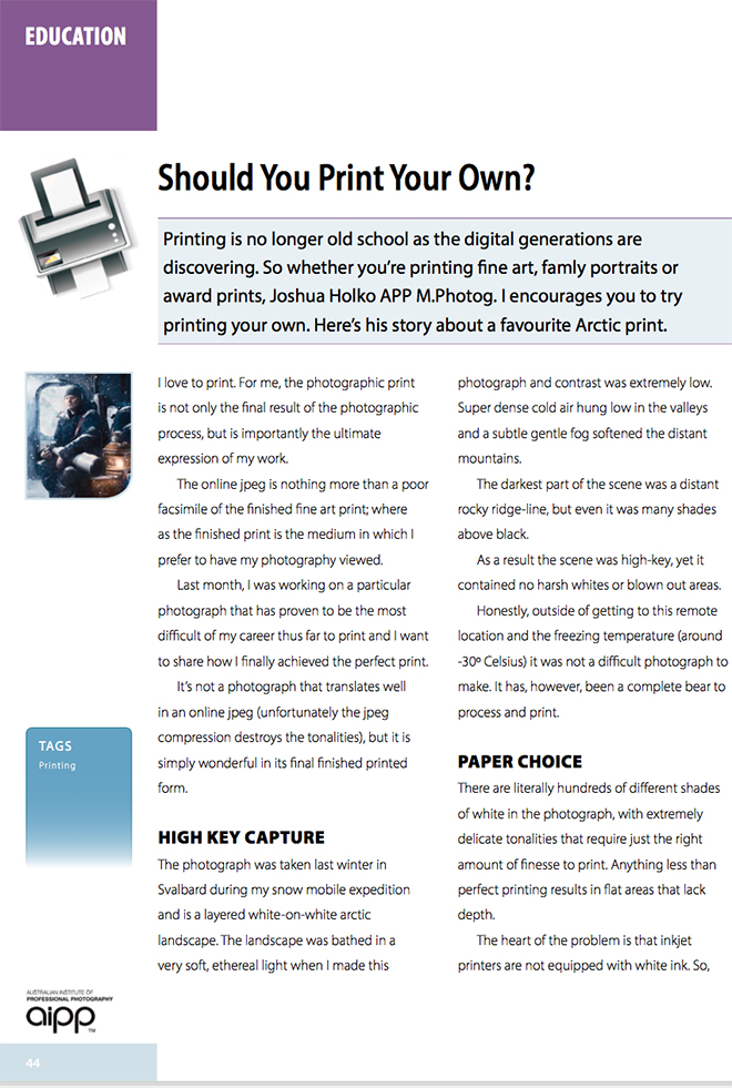 The latest September issue of the Australian Institute of Professional Photography (AIPP) Journal features an article I recently penned titled ‘The Toughest Print’. The article was also recently featured on the Luminous Landscape website. You can download a copy of the article by clicking on the image below (you do need to be a full AIPP member to download the complete issue).