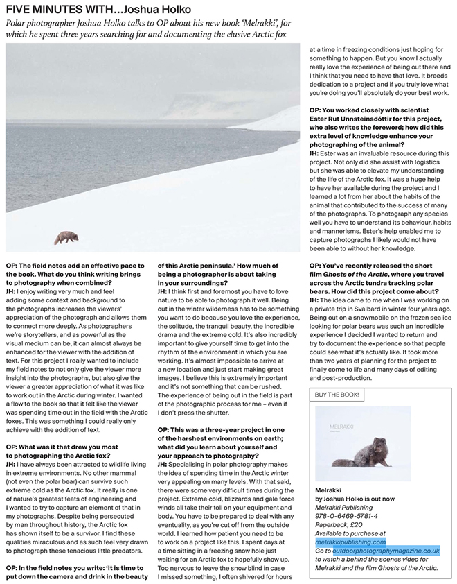 The latest April 2018 issue of Outdoor Photography Magazine features a new interview ‘Five minutes with Joshua Holko‘ about my Arctic Fox project in the north of Iceland and the subsequent book on the project Melrakki. There is also an extended Behind the scenes look on Outdoor Photography’s website. The limited edition hard cover of Melrakki has been long sold out, but it is available as an open edition soft cover HERE. If you enjoy the interview be sure to subscribe to the magazine.