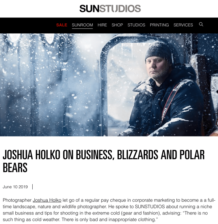 Sun Studios and Canon Australia have just published a recent interview I did with them titled ‘Business, Blizzards and Polar Bears’. The interview covers aspects of how I transitioned from my marketing day job in the corporate world, to running a full time photography business, to shooting in cold weather climates, as well as some thoughts and musings on camera equipment. Just click on the image below to read the full interview. My thanks to all at Canon and Sun Studios for their continued support.