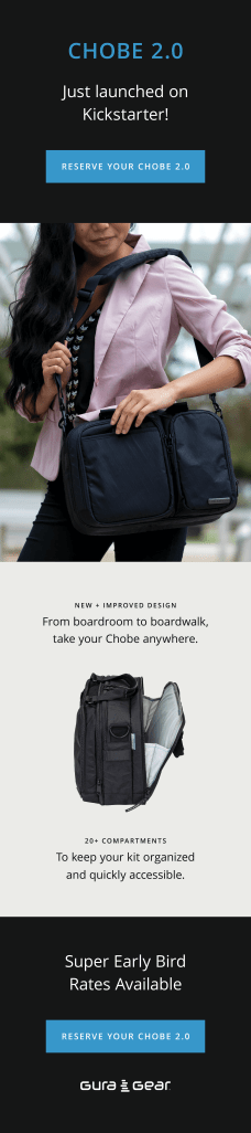 I am very pleased to announce that Gura Gear is launching the long-awaited update to the original Everday Carry, Chobe 2.0 on the Kickstarter platform and it is now available to Pre-Order! This is without doubt one of the most anticipated and requested camera bags on the planet. The original Chobe has been my go to carry on accessory bag for nearly a decade now and I am really excited to get my hands on the new model with all of its improvements. Perhaps best of all, the Chobe can now be ordered in either a 13″ or 16″ version to suit your travel laptop – perfect. Chobe can be ordered online by clicking on the image below.