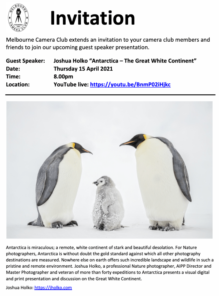 Somewhat short notice, but tomorrow evening at 8pm Australian Eastern Standard time I will be giving a digital and print photographic presentation on Antarctica – The Great White Continent at the Melbourne Camera Club in South Melbourne. The presentation will be live-streamed to You Tube for anyone who wishes to tune in.