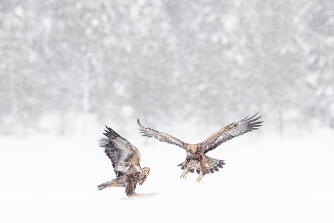 The first part of the workshop was focused on Wolves and Wolverines and saw us based close to the small town of Kuhmo near the Russian border where there are a number of photographic hides positioned in the demilitarised no man’s land region. These are the very same hides I use on my Autumn workshops to Finland (Read last year’s Trip Report) and are exceptionally well-positioned for photographers looking to capture wildlife photographs of these elusive species. Conditions for this period of time were exceptional with a fantastic covering of snow and soft overcast conditions. On several of the days, we had heavy snow and dramatic spindrift. At this time of year, there is sufficient daylight to shoot from roughly 8am until 5pm. Typically we were in the hides by 7am and departed not earlier than 5pm; giving us the maximum amount of time for photography and encounters. Although we were skunked on wolves this year (there were a lot of prints in the area), we did have a fantastic encounter with a young Wolverine that provided some exceptional photographic opportunities in the heavy snow. Both Golden and White Tailed eagles also visited on frequent occasions.