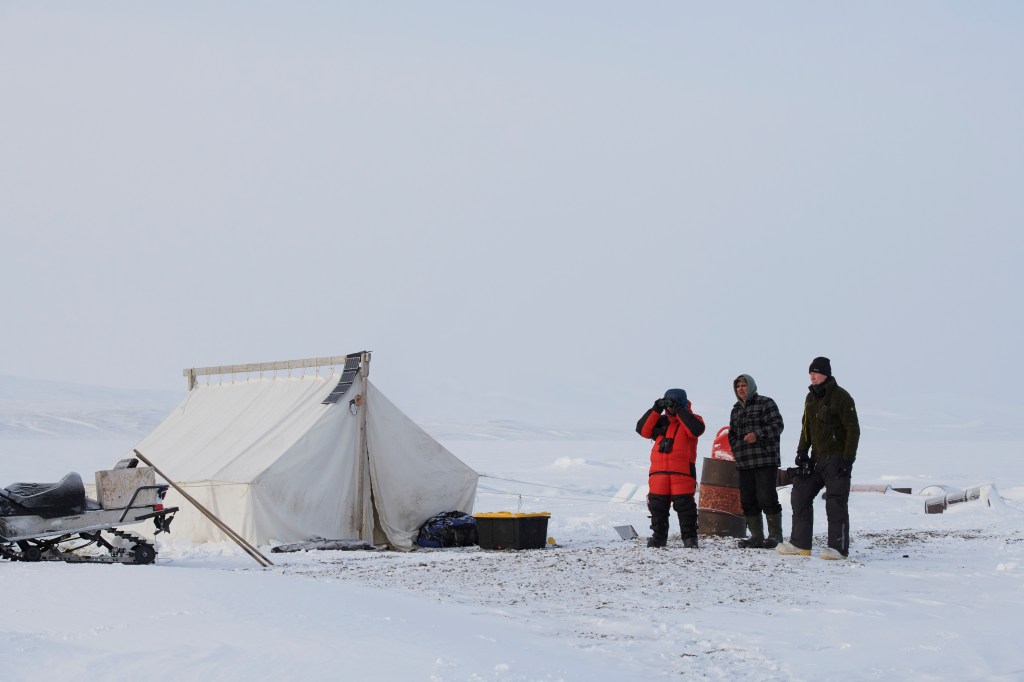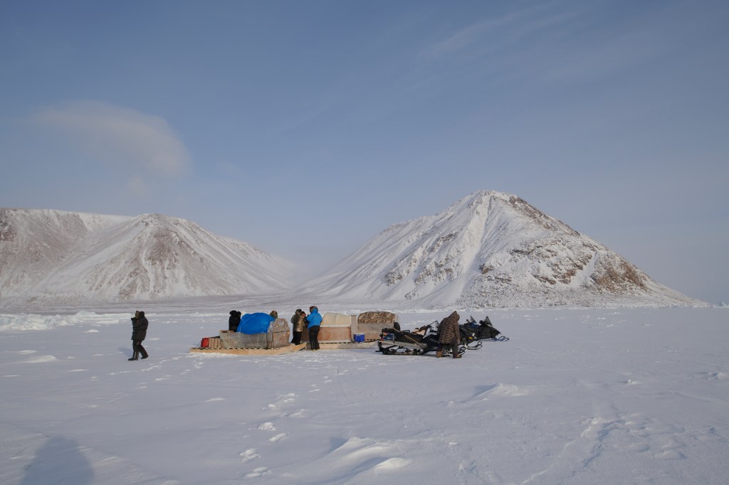 Our expedition team consisted of myself, David, three clients, and four local Inuit guides for a total of nine people. We had intended to take four clients but sadly lost one last minute to a COVID close contact. Marco, you were dearly missed. An expedition such as this into the remote wilderness in the Arctic Winter requires a lot of equipment, food, and fuel. We utilized four snowmobiles, all pulling sleds, that allowed us to take all the equipment we needed for our time in the field. Our first planned stop was a very remote hut on the edge of the sea ice that has been used by local hunters for years. Located approximately 120 kilometers north of Grise Fiord, the cabin is really little more than four aged wooden walls and a roof with a small diesel stove for heat. As it turned out, this would be our primary base for the duration of the expedition. Although extremely basic, it served as protection from the elements and a place to escape (even briefly) the extreme cold.