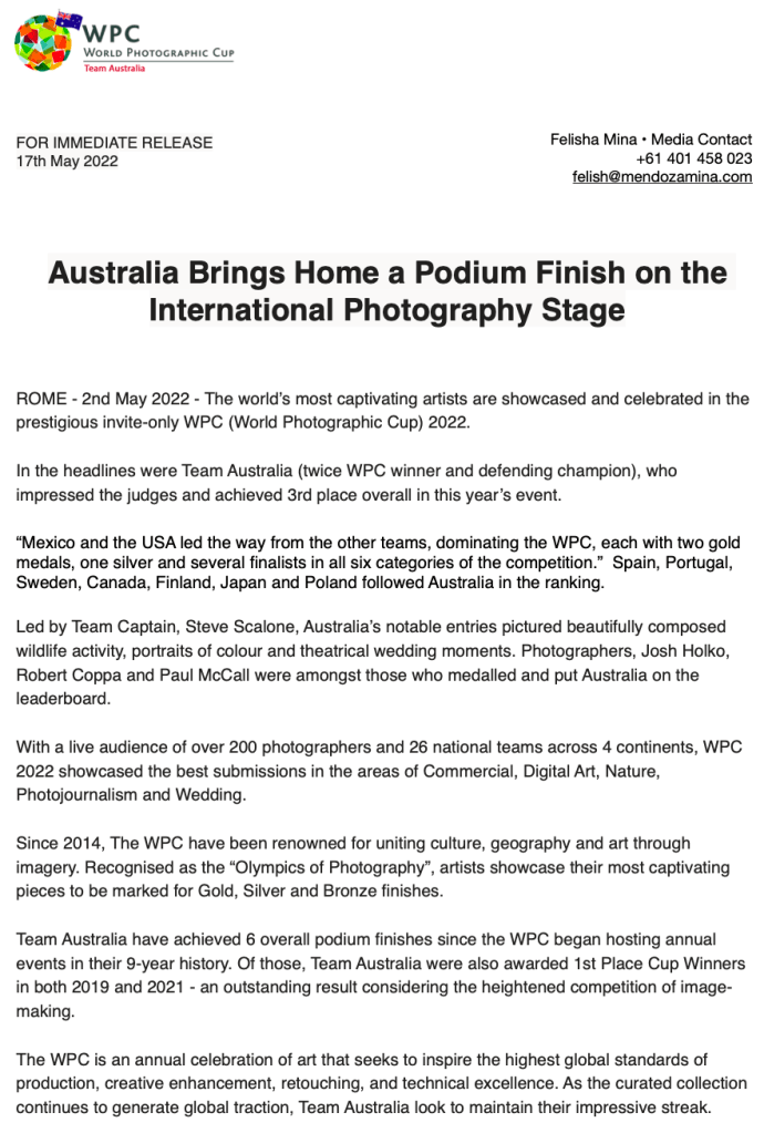 World Photographic Cup Team Australia Press Release 2022 May 17, 2022 Posted in UncategorizedFormat Post format: Image Share this: Click to share on X (Opens in new window) X Click to share on Facebook (Opens in new window) Facebook Like Loading... Related