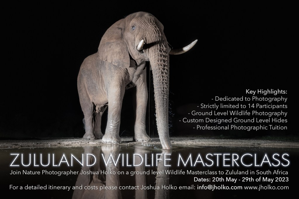 This is the workshop for you if you have ever wanted to photograph African wildlife from eye level. We will use custom-designed hides and a brand-new safari vehicle designed specifically for eye-level photography. Full details of this workshop: https://jholko.com/workshops/zululand-africa-ground-level-wildlife-masterclass Please contact me for information on last-minute places.