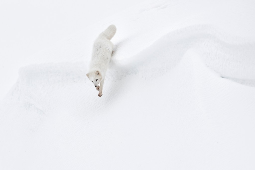 During this workshop, we had the opportunity to photograph both the Blue and White Morph Arctic Foxes almost every day. On several occasions, some of us were also fortunate to have them together for a brief interaction for those quick with the shutter. Moments like this are rare and require patience and a dollop of serendipity. When the foxes do come together, it is often for the briefest of moments, and one has to be ready and quick to catch the action.