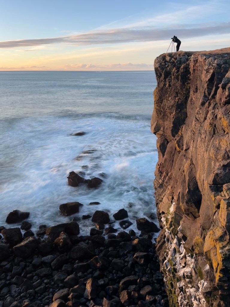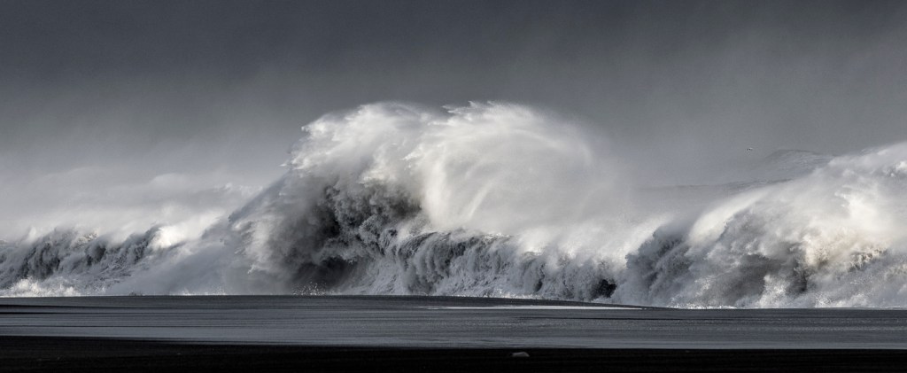From Snaefellsness, we travelled east to the gorgeous seaside town of Vik, where we were fortunate to encounter incredible storm seas upon arrival, unmatched in my experience. Gale-force offshore winds had whipped the sea state into a chaotic, frenetic maelstrom, creating incredibly dramatic (and scary) conditions. We stood mesmerised from the safe vantage point of the breakwater, photographing this powerful display of Nature’s fury. I had specifically chosen this breakwater as our vantage point, away from the main town, as I knew this was where the seas were at their most violent. Despite being out of town, it did not take long for us to be surrounded by a dozen passing tourists, all keen to join us as we photographed the wrath of Mother Nature.