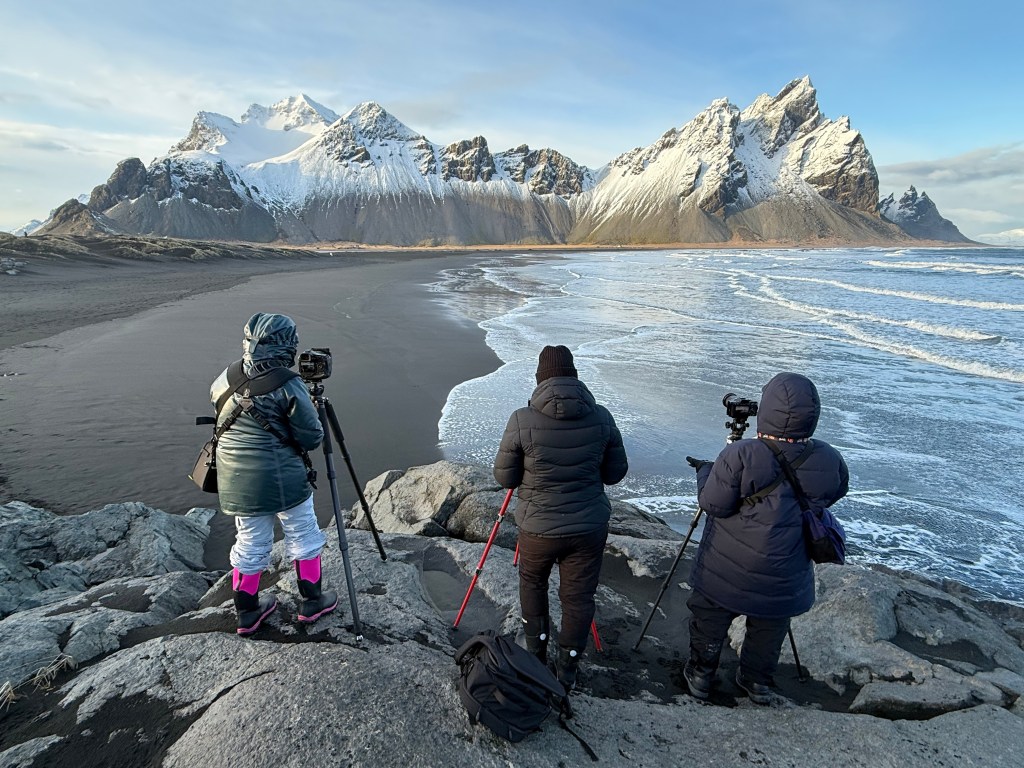 For our last evening, we travelled to Vestrahorn, where we photographed the stunning mountains of Stokksnes and reflections at sunset. This is an iconic location on Iceland’s southeastern coast, not to be missed. Mercifully, we had some of the best locations to ourselves and enjoyed several hours of photography up to sunset. Much has changed in Iceland over the last ten years, with the explosion in tourism and social-media Instagram locations making it virtually impossible to have locations such as this to yourself. One can still get lucky on occasion. Sunrise in particular offers the best chance for the lowest number of people at a given location.