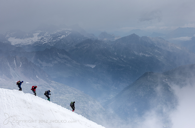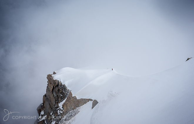 With no real mountains to speak of in Australia, I am not used to high altitude climbing and suffered from constant lack of breath, light-headedness and a severe headache after twelve hours at nearly 4000 metres. Whilst my Austrian companion seemed unaffected by the altitude I was forced to stop every few minutes to try and catch my breath as we made our way up the ridgeline. It was worth the pain, however, as the opportunity to photograph climbers returning from Mont Blanc along a very exposed ridge provided breathtaking views and photographic possibilities. We were taking a little bit of a chance with this climb as it was very windy and the pressure was dropping, with the possibility of a forecast storm. Spindrift was whipping off the peaks and, with eleven people loosing their lives on Mont Blanc in the last few weeks, I was less than thrilled at the thought of getting caught in an exposed position. I was, however, very keen to get some photographs, because the wind was whipping clouds and fog across the mountain at a rapid rate which was creating a lovely play of light. In the end, I climbed only a relatively short distance up the ridge as the conditions were just too dangerous for my experience at that altitude.