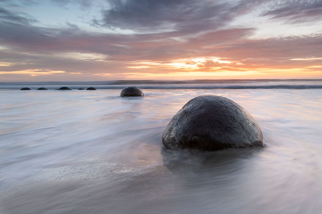We started our day at the Moeraki Boulders at 6:30 am to photograph them during the sunrise. Unlike last night’s shoot, this time the sun would rise from the sea which will make a completely different photograph with an impressive sky on the background. Luckily for us, the weather was cooperating, there was little to no wind and there were enough high clouds in the sky to add texture and retain the colours. The high tide has passed and this time I was able keep my shoes on.