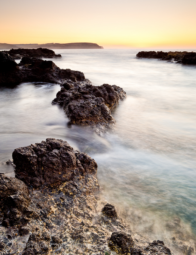 Cloudless skies at sunrise and sunset are not my preferred atmospheric conditions for Landscape photography. In general, I prefer overcast skies (Nature’s Soft Box); or at least some puffy or windswept clouds to pick up the colour of dawn and dusk and add an extra dimension. My weekend shoot at Cape Schank provided only clear skies; which although not ideal for interest in the sky did provide some lovely ethereal golden light, giving the basalt rocks an otherworld alien quality.