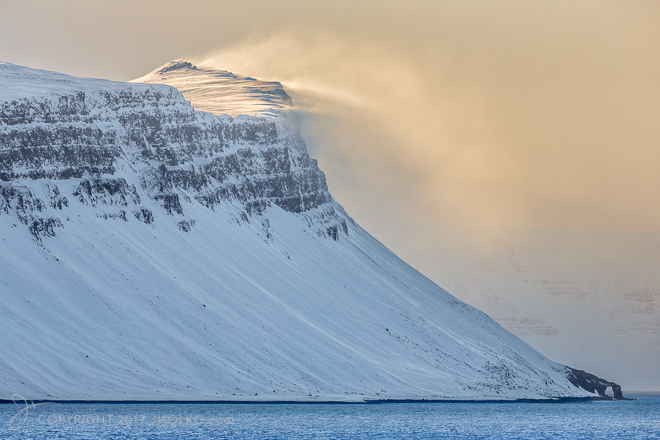 Yesterday I returned to Reykjavik after leading a new expedition to the remote north-west of Iceland to photograph Arctic Fox in winter. I have been travelling to this remote nature reserve in the north of Iceland for the last four years to photograph Arctic Fox but this was the first time I have taken a group with me. We had some amazingly close encounters with several Blue Morph Arctic Fox during our time in the north and I will have a full trip report soon. As well as Arctic Fox we also took some time to photograph some of the dramatic landscape found this far north in Iceland. This particular photograph of snow being blown from one of the surrounding peaks at sunset from my 2016 expedition is my photograph of the month for March 2017.