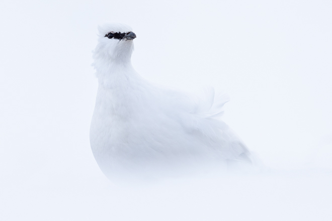 I have been wanting to photograph Ptarmigan in their winter plumage in some nice clean snow for some time now and finally got my chance this Winter in Svalbard. This was one of three Ptarmigan that were feeding on some patchy snow covered ground just outside the small town of Longyearbyen. To make this photograph I simply positioned myself down low to try and get the bird on the clean snow. Seasonally camouflaged; the Ptarmigan’s feathers moult from white in winter to a mottle brown in spring or summer. In winter, its plumage becomes completely white except for the small patch near the eye.