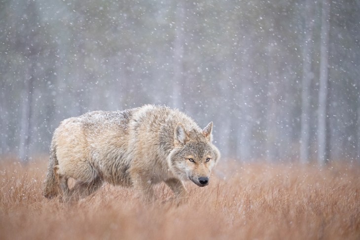 The photograph of the month for March 2021 comes from ‘no-mans’ land between northern Finland and Russia and is of a young wolf slinking across the water logged landscape during a late Autumn snowfall. This photograph appeals to me on multiple levels. There is a wonderful ‘hunters’ glean in the wolfs eyes that has both purpose and focus. The soft grasses in the foreground and the out of focus forest area in the distant background really add wonderful context and the first snows of winter add that wonderful touch of drama. Ultimately, this photograph works because it was taken at eye level with the subject, which draws the viewer into the wolfs world. Anytime you can photograph wildlife at eye level you have a strong chance of creating a far more intimate photograph than would otherwise be possible.
