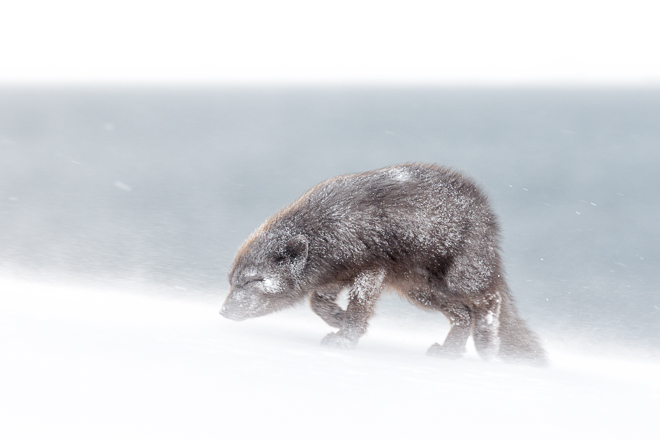 In this photograph, I wanted to use the wonderful shapes in the windswept foreground snow to help frame the fox in the context of its surroundings. It is, in my experience, a rare combination to find both wildlife and sculptured and textured snow. The added drama and impact of the blizzard caps off a wonderful moment with this blue morph Arctic fox.