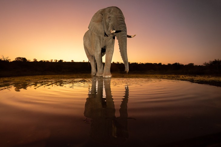 The photograph of the month for July 2023 comes from my recent ground-level wildlife masterclass in Zululand, South Africa (read the trip report) and is of a large bull Elephant that came to drink at one of the watering holes on first light. The photograph was taken from one of the game reserves’ state-of-the-art overnight hides with a 14-35mm f4L IS Lens at 14mm. I had set up the camera on a tripod, ready to go in the eventuality an animal would come to drink. After sitting in the hide all night, having such a wonderful opportunity was manna from heaven. Photographs such as this are often pure serendipity. Outside of having the technical proficiency to capture such rare opportunities, it sometimes comes down to a little luck with the wildlife arriving on the scene at just the right time. In this case, the night in the hide had been quiet, with no activity and no animals coming to drink at the watering hole (a test of patience). Then, on first light, this large male Elephant walked out of the trees to sake its thirst. The Elephant stayed in what was the best light of the day for maybe a minute before it wandered back into the bush. During the minute the Elephant came to drink, I don’t think I drew more than a breath or two, my heart racing, recognising the unique and special opportunity I was being provided. Best of all, I could share it with the others in the hide.