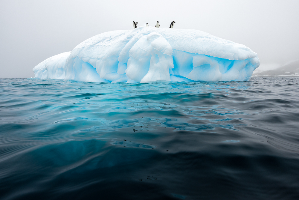 Our time in the Weddell Sea saw us in full expedition mode, cruising for tabular icebergs and Emperor penguins. Late in the day, I put Zodiacs in the water to photograph the Emperor Penguin and Adelies at eye level as they rested on a small ice flow in stunning soft light and gentle snowfall.