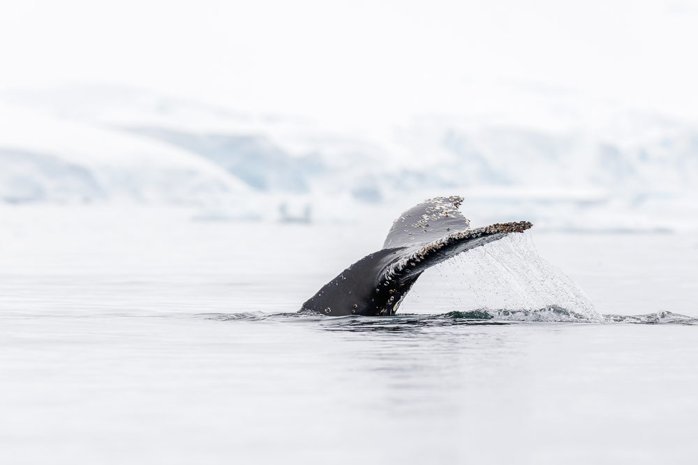 The following day, we had an early morning Landing at Petermann Island after breakfast in soft, overcast conditions, followed by a fantastic zodiac cruise with around half a dozen humpback whales feeding amongst the icebergs. Opportunities to photograph the whales against the many glacial backdrops were in abundance, and we spent several hours in the zodiacs photographing the many humpbacks. Whale photography can be problematic from the high decks of expedition vessels, but from the water level of a small zodiac, it is possible to capture powerful photographs of these ocean-dwelling giants.
