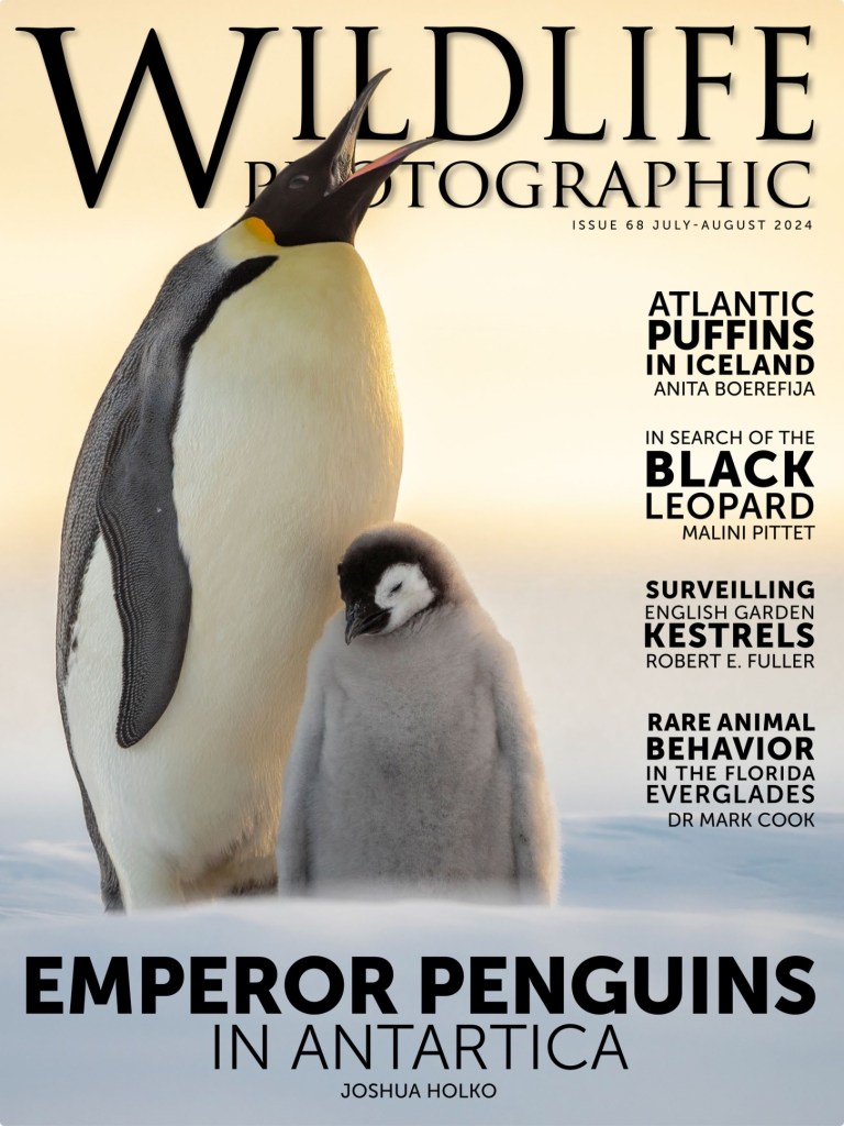 The just-published July / August 2024 issue of Wildlife Photographic magazine includes one of my photographs of Emperor Penguins on the front cover and a feature article on my experiences photographing Emperors in the deep south of Antarctica. This is the seventh time I have been published in Wildlife Photographic and the sixth time I have been fortunate to score the cover shot! (the last five cover shot editions were on Walrus photography, Grey Wolf Photography, Pallas Cat Photography, Arctic Fox Photography, and Polar Bear Photography). I have also been previously been published in Wildlife Photographic for my Emperor Penguin photography.