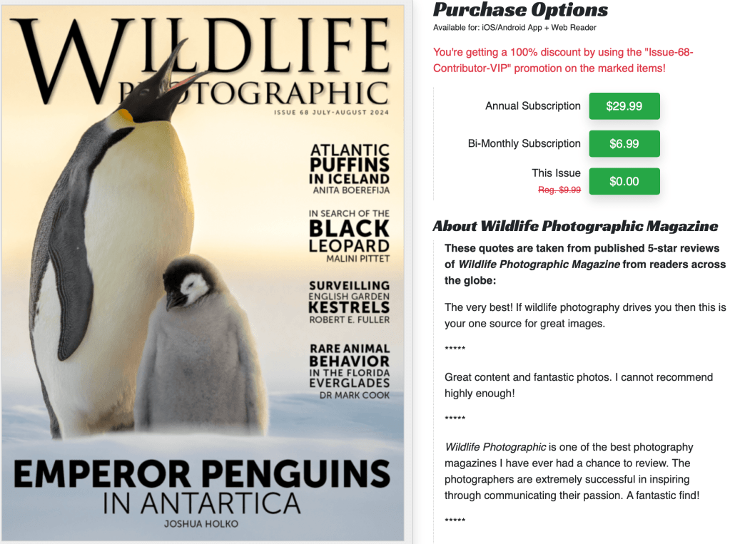 Wildlife Photographic can be read on iOS and Android devices, as well as from any computer via our Web Reader at MagsFast. Please use the following link to obtain your free issue: Free Subscription to Wildlife Photographic Magazine.