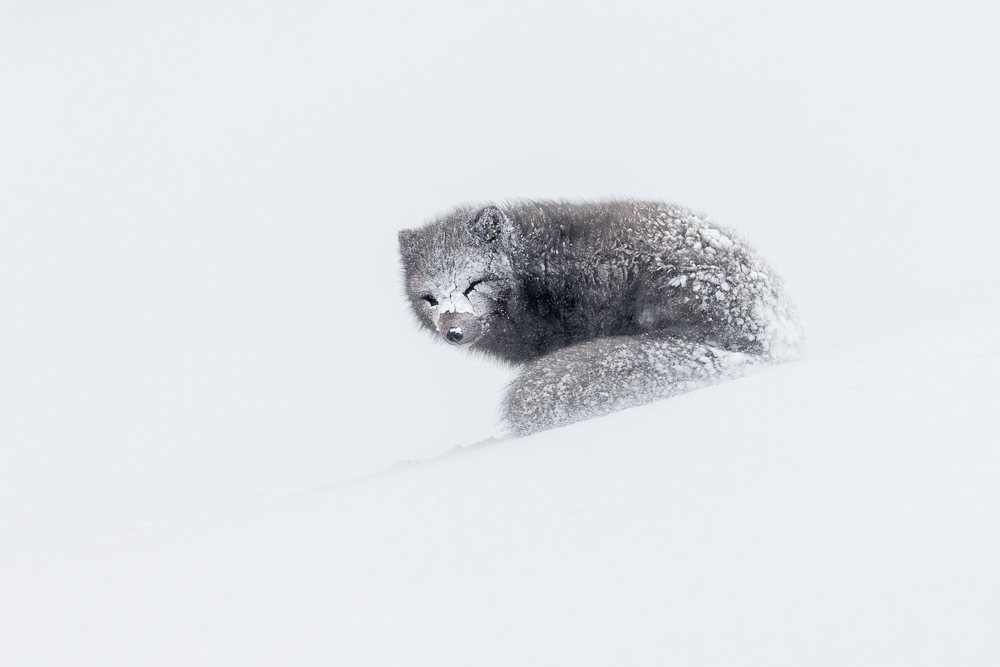 Without a doubt, my favourite conditions for photographing the Arctic Fox are winter blizzard conditions. The flying snow creates a white-out that cleans up any background mess, and the flying snow sticks to the fox’s coat and gives extraordinary context and much-needed drama. These conditions define the environment of the Arctic fox and paint the perfect canvas on which to photograph this amazing opportunist. Contrary to appearances, these conditions are far easier to photograph in than they appear. With modern auto focus in mirrorless equipment, the cameras have no problem finding and tracking the eye of the Arctic Fox in these conditions. In past years, I would often stop down the lens to ensure adequate depth of field if focus missed slightly. Now, with eye-auto focus, I can open up the lens and shoot wide open, as in this case – f4 at 600mm. Why shoot wide open? A wide-open aperture helps soften the surrounding snow’s slope, creating a contained picture inside the 35mm frame. This technique can be used to great effect to help keep the viewers eye both inside the frame and on subject.